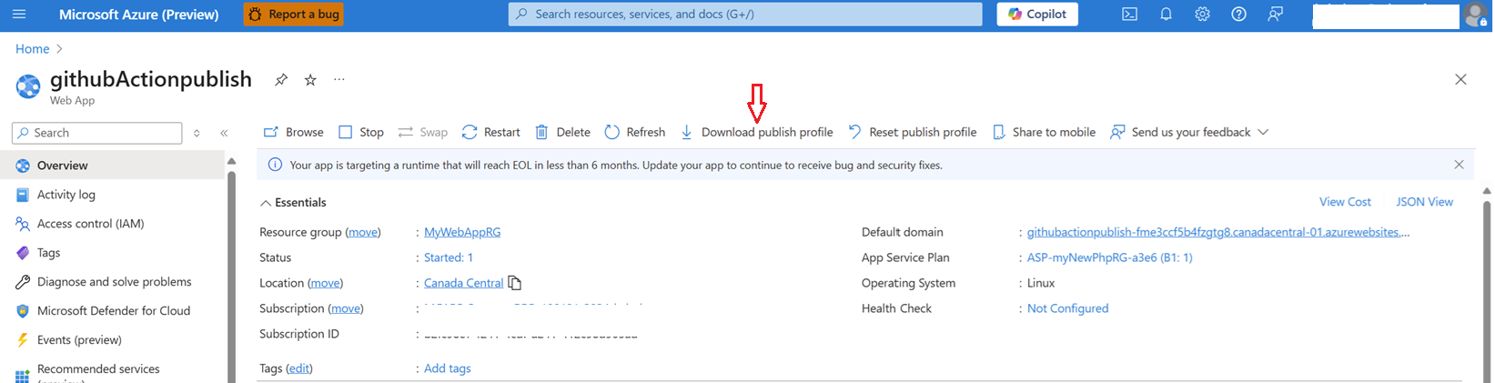 As we will be deploying using the publish profile, please download the publish profile by clicking on “Download publish profile” as shown below:
